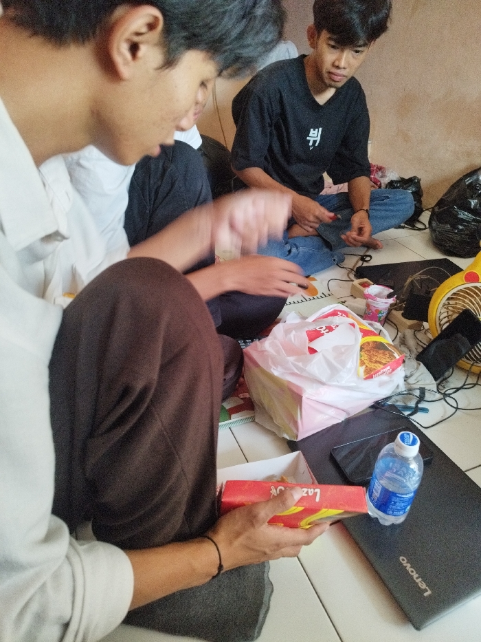 In an indoor setting in Muka, Indonesia, three males are seated on a light-colored tiled floor with a plain, light-brown wall in the background. In the left foreground, a male with dark hair and a light-colored collared shirt is partially visible, facing right. He wears dark pants and holds a red "Lazat" branded rectangular food box in his hands. His right arm is visible, showing a black string bracelet on his wrist, and his left hand is blurred due to motion. In the middle background, a male with short dark hair and a light beard sits cross-legged, wearing a black t-shirt with a white character design and ripped blue jeans. He looks towards the left, holding a small red object in his hands, appearing to manipulate it. A third, less distinct individual is partially visible behind the foreground male. Various items are arranged on the floor between the individuals: * A grey Lenovo laptop is positioned on the right. * A clear plastic bottle of mineral water with a blue cap rests on the laptop. * A large white plastic bag contains a pink box and other items, including a package of instant noodles. * To the right of the plastic bag, a white power strip with multiple plugs is visible amidst tangled black cables. * A small yellow desk fan is situated near the power strip. * Several small plastic cups and containers are scattered nearby. * A crumpled black plastic bag is visible in the far right background. The scene depicts a casual gathering with food and electronics spread across the floor.