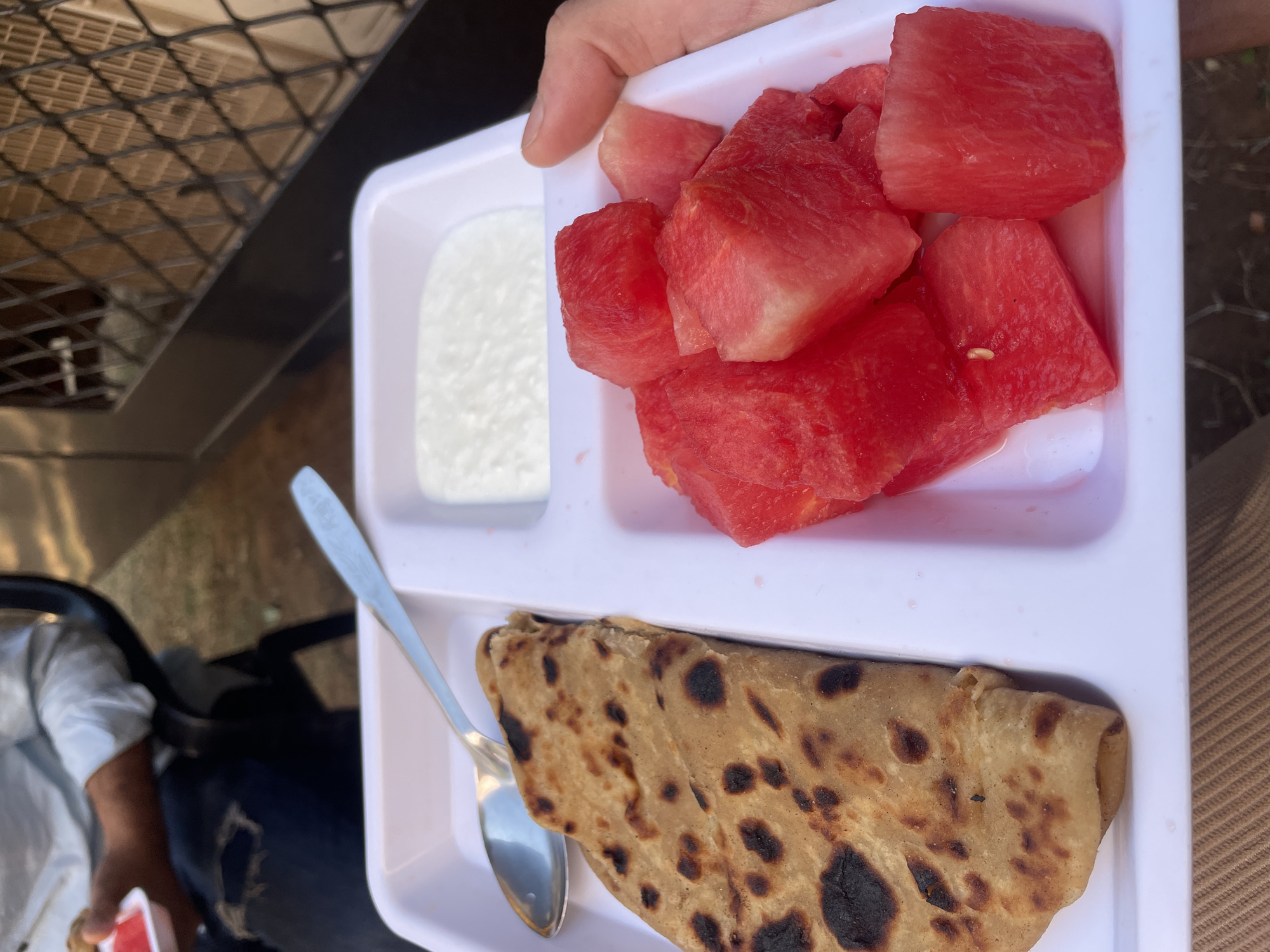 Here is a detailed description of the image: **Scene Overview:** The image shows a white, multi-compartment tray held by a person. The tray contains cubed watermelon, a small portion of what appears to be white yogurt, and a folded flatbread (likely roti or paratha). A spoon is resting on the tray next to the flatbread. **Objects & Subjects:** * **Tray:** White plastic or melamine tray with three compartments. * **Watermelon:** Cubed pieces of red watermelon. * **Yogurt:** A serving of white, smooth yogurt in one compartment. * **Flatbread:** A folded flatbread with visible browning, possibly roti or paratha. * **Spoon:** A stainless steel spoon. * **Person:** Only a hand holding the tray and partial view of clothing is visible. **Actions & Interactions:** * A person is holding the tray of food, presumably preparing to eat or having just finished eating. * The food components suggest a combination of sweet (watermelon), savory (flatbread), and potentially cooling (yogurt) elements. **Environment:** * The background shows a mix of natural and artificial elements. There's a mesh-like structure, suggesting perhaps the side of a vehicle. Part of an arm with blue clothing is visible in the left lower part of the photo. The image appears to be taken outdoors, possibly in daylight. Based on food items in the image, it is likely to be in India. Given location is in Kolhapur, India is possible, but there is no definite way to verify location from the image.
