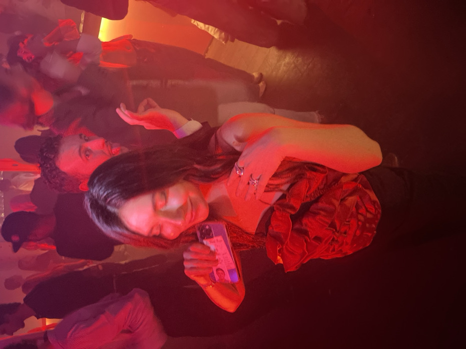 In a dimly lit, red-toned environment, a woman reclines, eyes closed, cradling a cell phone displaying a photo ID. She wears rings on her fingers and a soft fabric drapes over her torso. A man's face is partially visible behind her, looking towards the camera. The background is filled with indistinct figures, possibly in a crowded setting. The overall composition suggests a candid moment captured in a nightclub or party atmosphere.