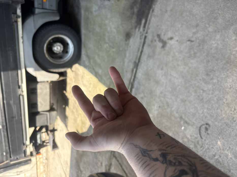 The image displays a close-up of a human left hand performing the "rock on" gesture, with the index and pinky fingers extended and the middle and ring fingers curled. The hand exhibits a large, partially visible tattoo on the inner forearm depicting an animal-like design, and a smaller 'x' mark tattoo on the outer forearm. The scene is located in Dimitrovgrad, Bulgaria. In the blurred background, a grey utility truck or flatbed truck is parked on a concrete surface, with its rear wheel and a portion of its dark-colored bed visible. Natural daylight illuminates the scene, casting shadows on the concrete ground. No other individuals or specific interactions are visible within the frame.