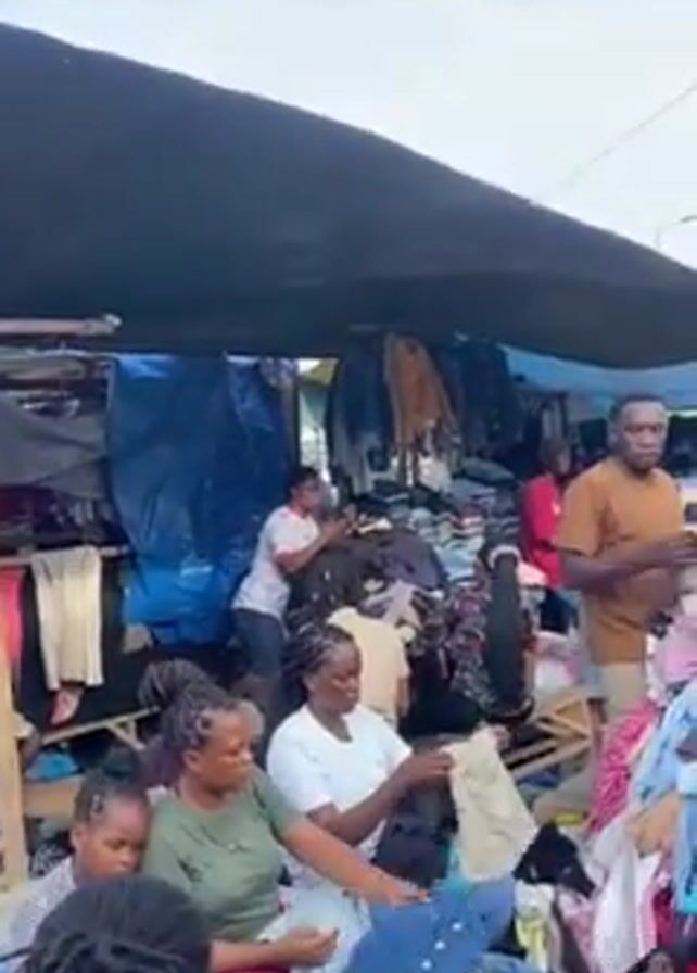 crowded outdoor market scene under a makeshift canopy, where people are actively sorting through piles of used clothing