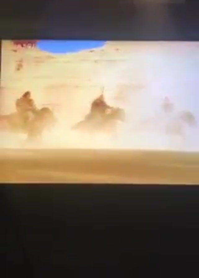 television screen displaying a scene with people riding horses in a desert setting