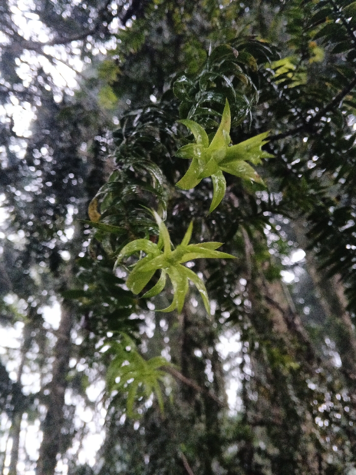 Low angle shot of evergreen foliage with three distinct, star-shaped clusters of light green leaves in focus. Water droplets adorn the leaves, suggesting recent rain. Behind the foliage, blurred tree trunks stretch upwards, creating a dense forest scene. The overcast sky, visible through the trees, contributes to a somber mood. The photograph captures the texture and detail of the flora.
