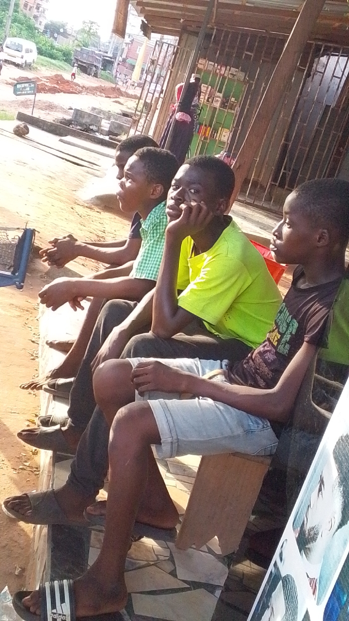 - "Four young males are seated on a low, tiled ledge in Obosi, Nigeria, during daylight" by FM-Jqbih2, licensed under CC BY 4.0