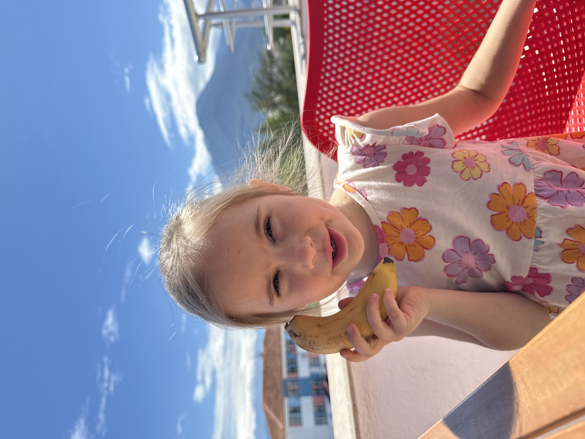 A young girl with fair hair, wearing a white dress with flower patterns, is holding a banana. She is sitting in a red chair on a sunny day. In the background are blue skies, clouds, a mountain, and a building with blue and white windows. The scene appears to be located in Fethiye, Turkey.