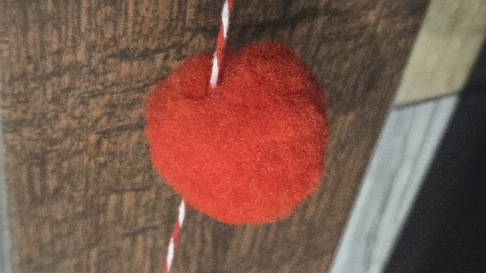- "A fuzzy red pom-pom hangs from a white and red twine against a backdrop of mottled brown and grey" by FM-0J88a2, licensed under CC BY 4.0