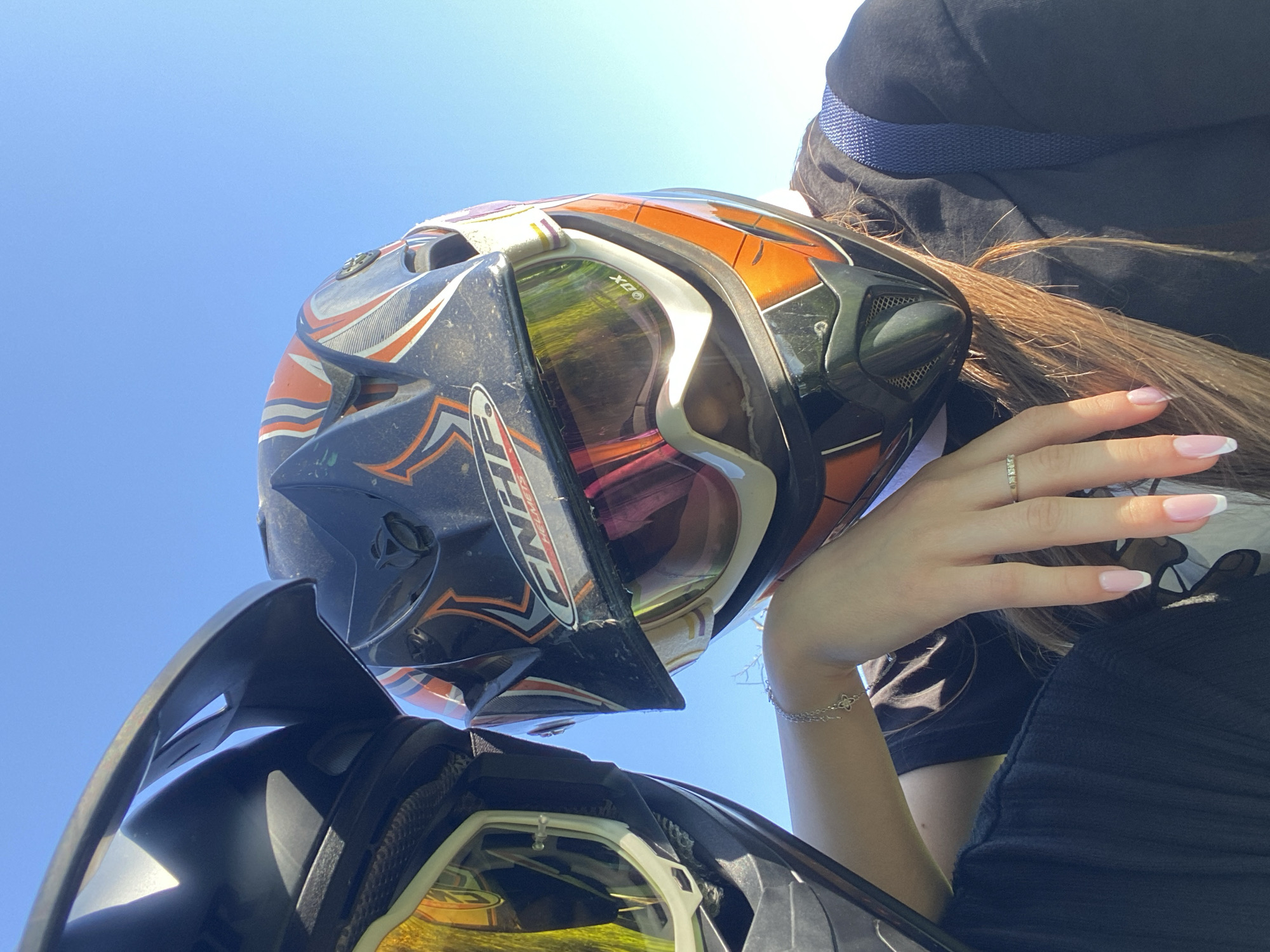 A low-angle, close-up shot shows two motorcycle helmets against a clear blue sky, likely taken in Konstantinovo, Bulgaria. The helmet in the foreground is predominantly black, with a tinted visor reflecting a landscape. The second helmet is orange and grey with a mirrored visor. A hand with manicured nails and a ring rests near the second helmet. A bracelet is visible on the wrist. The person is wearing a black top, with a glimpse of a blue strap.