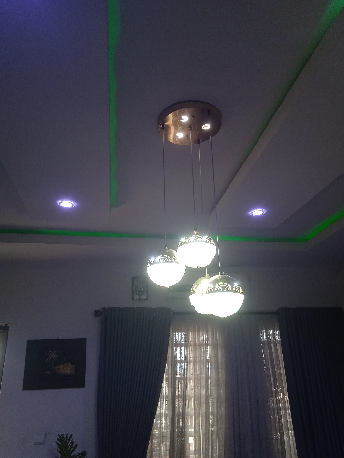 This image depicts an interior residential space, reportedly located in Lagos, Nigeria. The view is angled upwards, focusing on the ceiling and upper walls of a room. The white ceiling features a multi-tiered design with two active recessed circular spotlights emitting white light, and linear green LED strip lighting highlighting some structural edges. A central, circular, gold-toned metallic fixture is mounted on the ceiling, from which four pendant lights are suspended at varying heights. Each pendant light comprises an illuminated spherical glass orb, encircled by a decorative gold-toned band with a perforated pattern. The room's walls are light-colored. On the left wall, a dark-framed artwork is displayed, illustrating a nighttime scene with two illuminated palm trees on an island against a dark background. To the right, a window is visible, covered by light-colored sheer curtains and partially drawn dark grey pleated drapes. A dark curtain rod with a decorative finial is present above the drapes. A metallic-framed, rectangular object is partially visible on the wall above the sheer curtains. In the bottom-left foreground, a portion of a green, broad-leafed plant is visible. No individuals are present in the scene. The environment is brightly illuminated by multiple internal light sources.