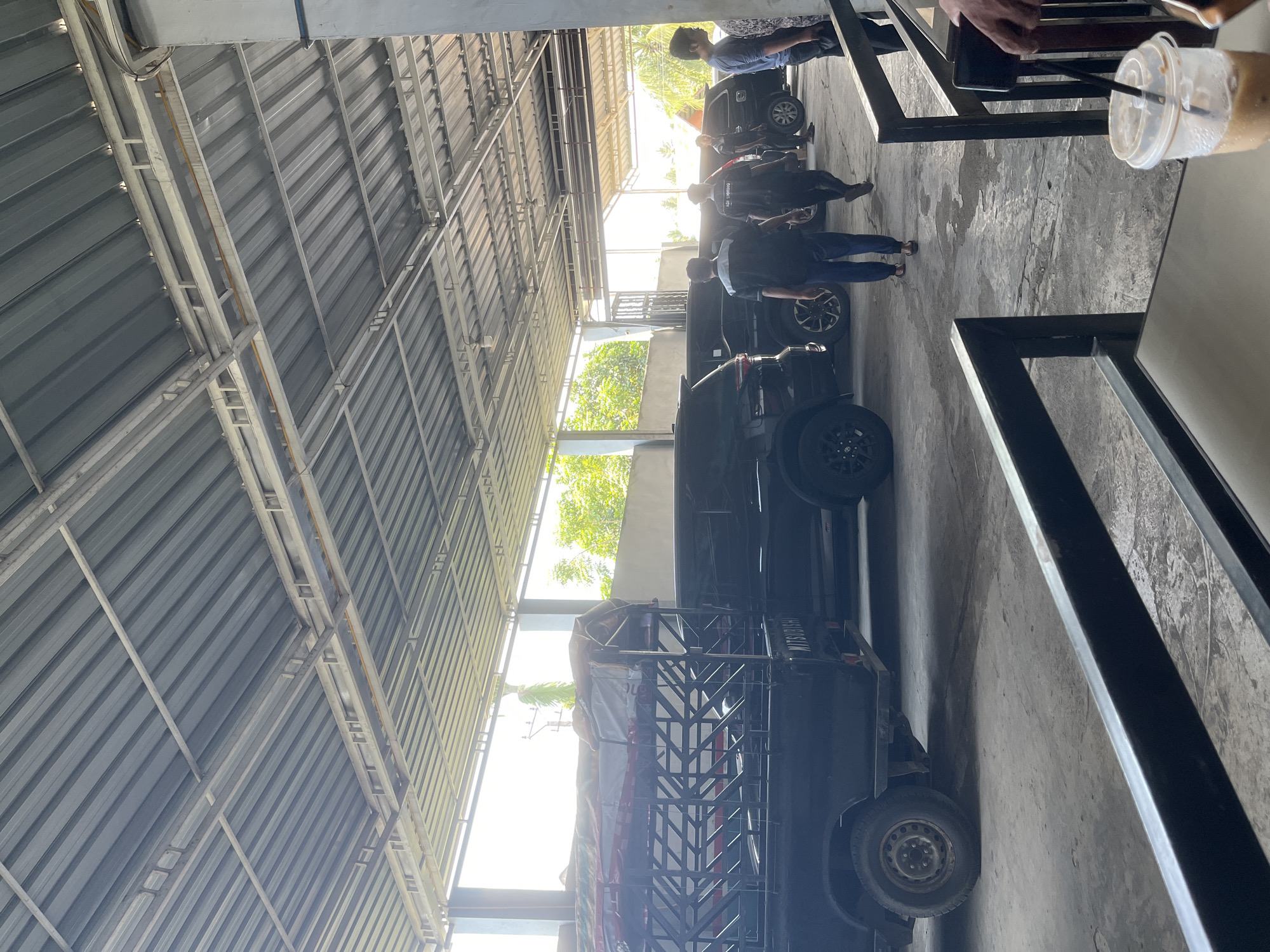 The image appears to be taken from an elevated position under a metal roof structure. Below, several vehicles are parked, including a truck towards the foreground. Several people are standing near the vehicles. The scene appears to be a parking area or a loading zone. The location is Palohlada, Indonesia.