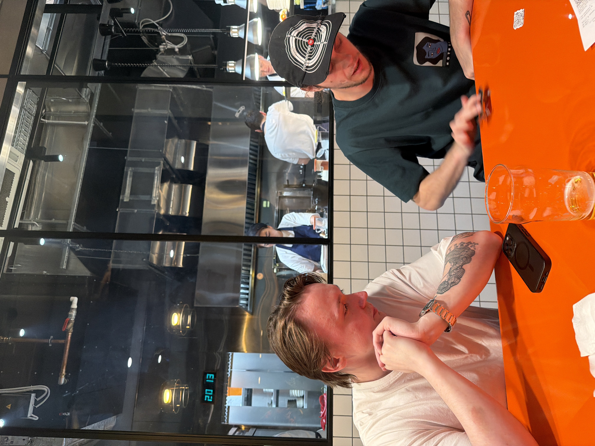 Two people are seated at an orange table in a restaurant. One person is wearing a black baseball cap with a target design and a dark green t-shirt with a logo. They are manipulating a small object on the table with their fingers. The other person, wearing a white t-shirt, is leaning their head on their hands. A black smartphone is on the table, next to a partially consumed beer. Behind a glass wall, restaurant staff in white uniforms are working in a kitchen with stainless steel equipment. A digital clock on the wall reads "20 13." This scene may be located in Moscow, Russia.