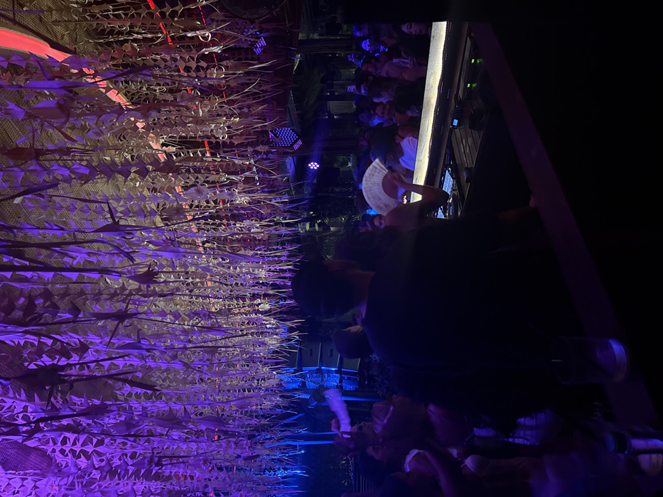 The image captures a crowded nighttime event within a semi-enclosed venue in Canggu, Indonesia. The overhead structure features a ceiling adorned with numerous light-colored, possibly natural fiber, decorative strands hanging vertically, illuminated predominantly by purple and blue ambient lighting. In the mid-ground, a male individual, viewed from behind, wears a dark baseball cap and a dark t-shirt. He stands at what appears to be a DJ booth or performance stage. To his immediate right, partially obscured, another individual holds a light-colored, open hand fan and is actively fanning themselves. DJ equipment, including mixers and controllers, is visible on the surface of the booth. To the left of the central figure, large black speaker stacks are positioned. The background reveals a dense crowd of numerous individuals, their faces largely indistinct due to the low light and motion. These patrons appear to be socializing and observing the activity at the booth. In the immediate foreground, a dark railing or counter is visible, on which a clear glass containing a translucent liquid rests. Scattered red and blue stage lights contribute to the dynamic ambiance. The overall environment suggests an active club or performance space.