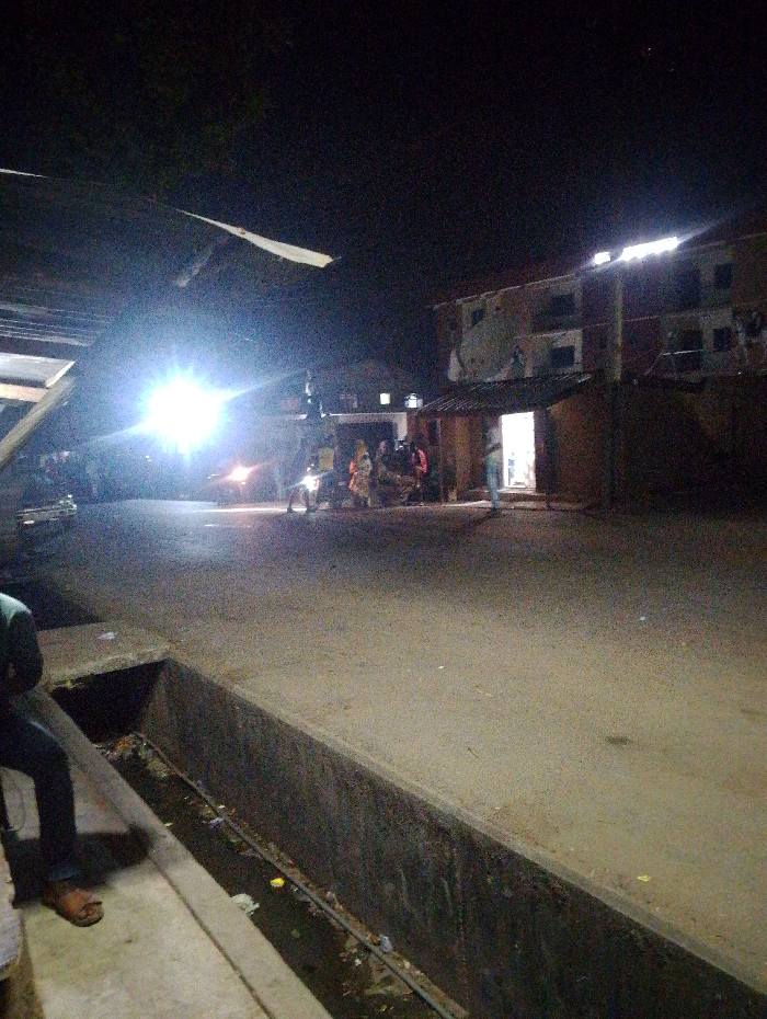 Night scene depicting an urban area. Bright streetlights illuminate a street with people gathered near shops. A vehicle with headlights on is partially visible in the background. A concrete drainage ditch filled with debris runs along the foreground. A person sits with their legs dangling, wearing sandals. The image is grainy due to the low light conditions. Buildings are visible in the background, one appearing to be two stories tall.
