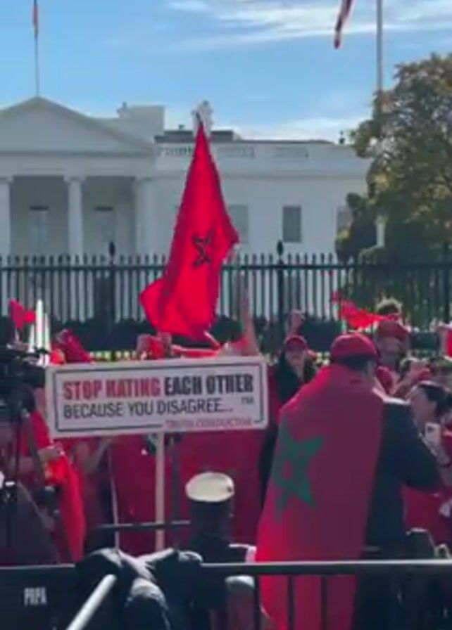 group of people protesting in front of the White House. They are holding red flags and wearing red clothing. A sign reads "STOP HATING EACH OTHER BECAUSE YOU DISAGREE...". An American flag waves on a flagpole in the background. The sky is blue and clear. The protesters appear to be passionate and engaged.