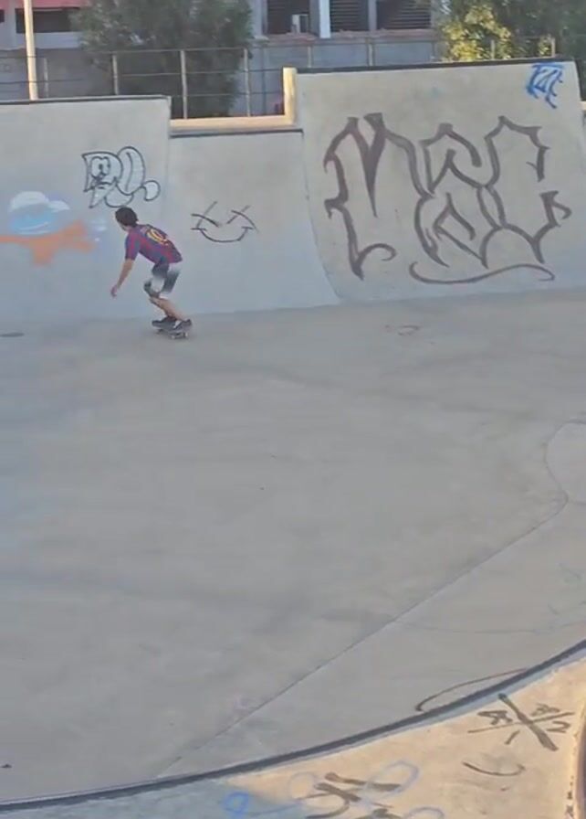 A young person is skateboarding in a skatepark. The skateboarder is wearing a blue and red soccer jersey and gray shorts. The skatepark is concrete, with graffiti on the walls. The skateboarder rides up one side of the bowl, crosses the flat section, and then rides up the opposite wall. There is a red building in the background.