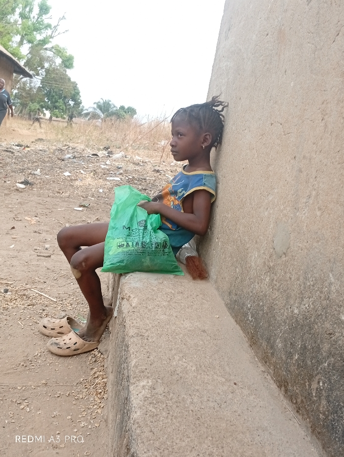 A young girl sits on a concrete bench, leaning against a wall. She holds a green plastic bag, her expression pensive. She wears a blue and yellow shirt and dirty sandals. The ground is dry and littered with debris. A figure walks in the background. The scene appears to be in a rural or impoverished area.