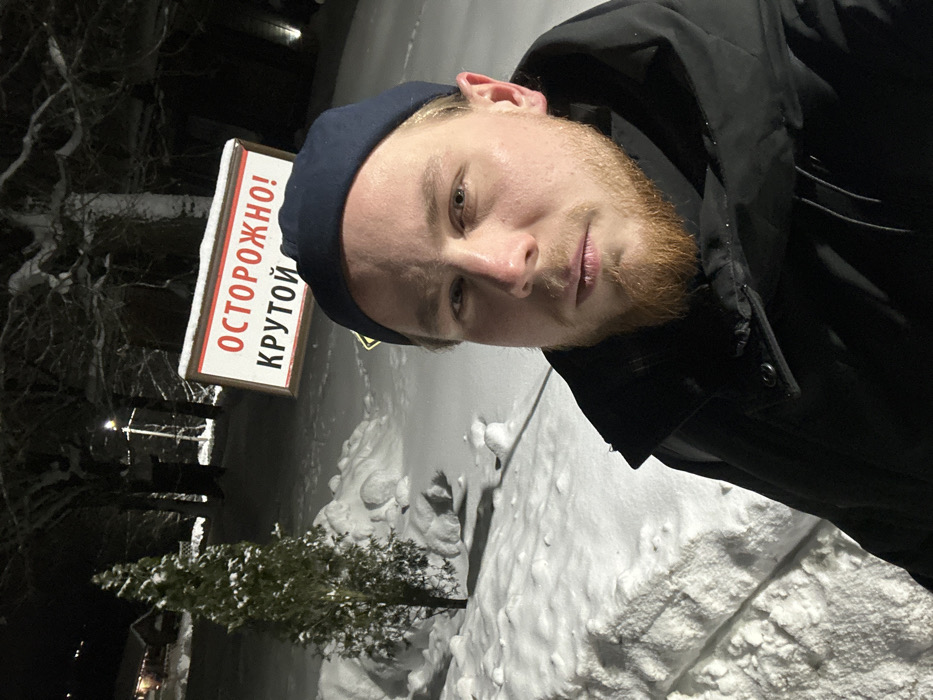 A man wearing a dark beanie and jacket takes a selfie outdoors at night. Snow covers the ground. A sign in the background reads "ОСТОРОЖНО! КРУТОЙ" in Russian, meaning "Caution! Steep/Cool". A small evergreen tree stands covered in snow near the sign. The lighting is dim, with some light sources visible in the background.