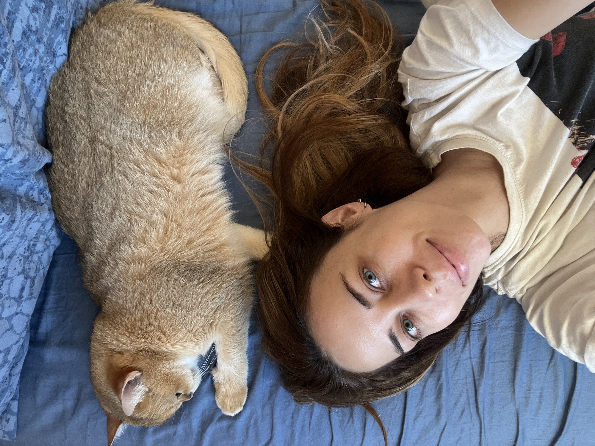 - "The image presents an overhead view of a woman and a cat lying on a bed in an indoor setting within the city of Bjeliši, Montenegro" by FM-aQUtB3, licensed under CC BY 4.0