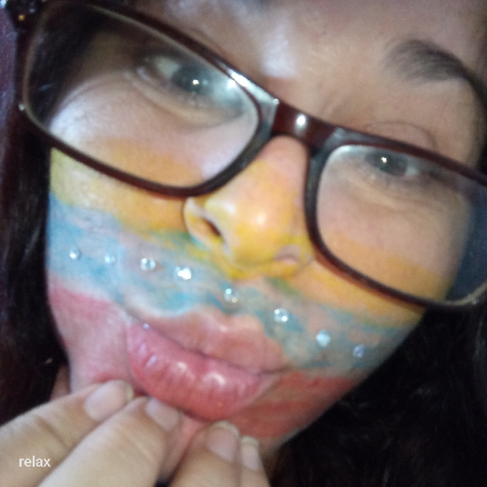 A close-up captures a person with glasses, face painted in rainbow hues. Starting with red at the bottom, the colors transition to blue and then yellow across the cheeks. Small, sparkling rhinestones are strategically placed along the blue stripe. One hand gently touches the person's mouth. The lighting highlights the colors and reflective elements, contrasting against the dark hair framing the face. The word "relax" is printed in white at the bottom left.