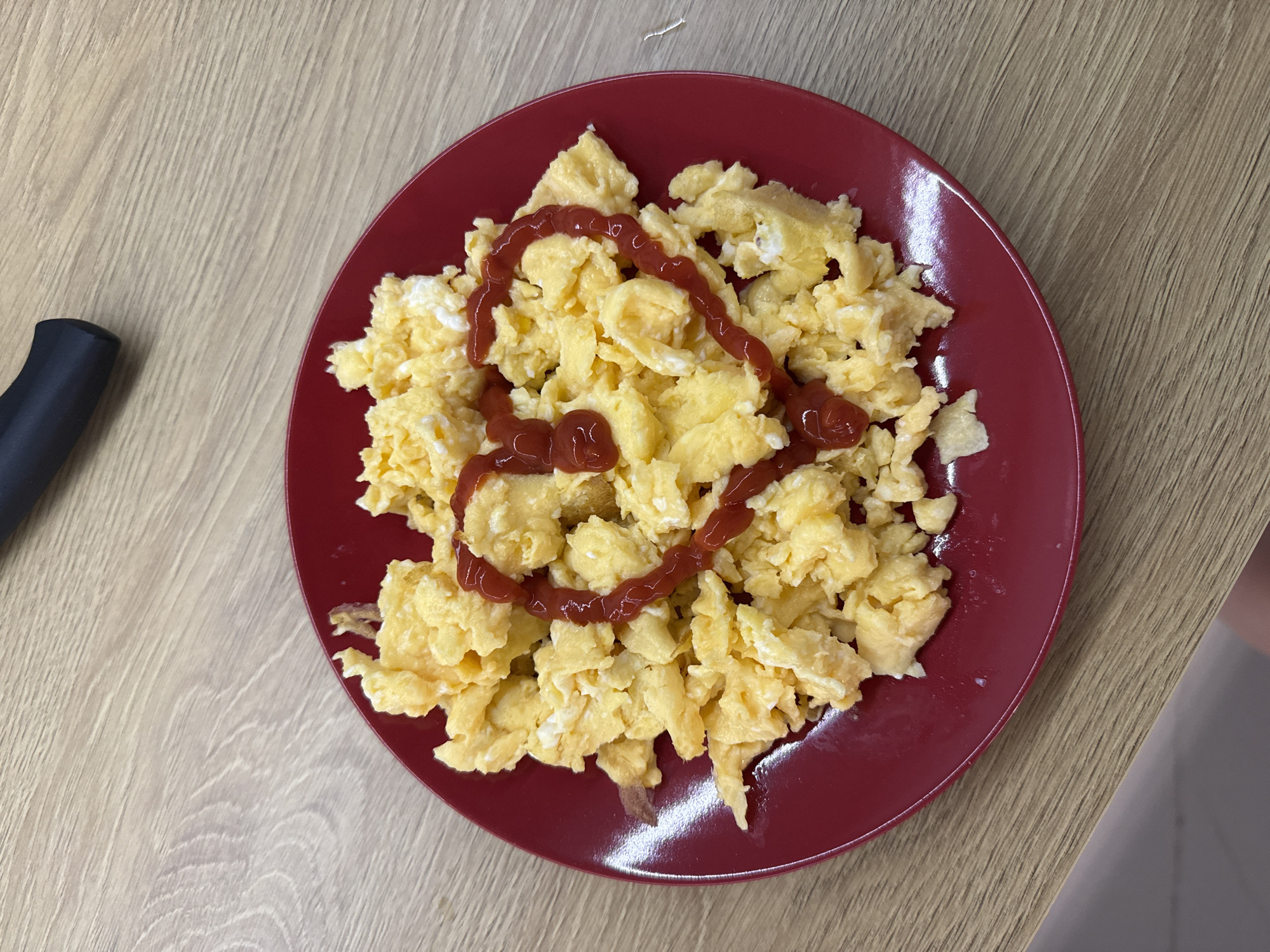 A red circular plate is centrally positioned on a light-colored wooden surface, likely a table or countertop. The plate contains a serving of scrambled eggs, characterized by their yellow and white coloration and typical texture. A heart shape has been meticulously formed on top of the eggs using red ketchup, with a small vertical line extending downwards from the bottom curve of the heart, dividing it. In the upper right corner of the image, the black handle of a knife or similar utensil is partially visible. The wooden surface displays a subtle grain pattern. No individuals are present. The environment appears to be an indoor setting, possibly a kitchen or dining area. The specific location within the city of Sofia, Bulgaria, cannot be determined from the provided visual information.