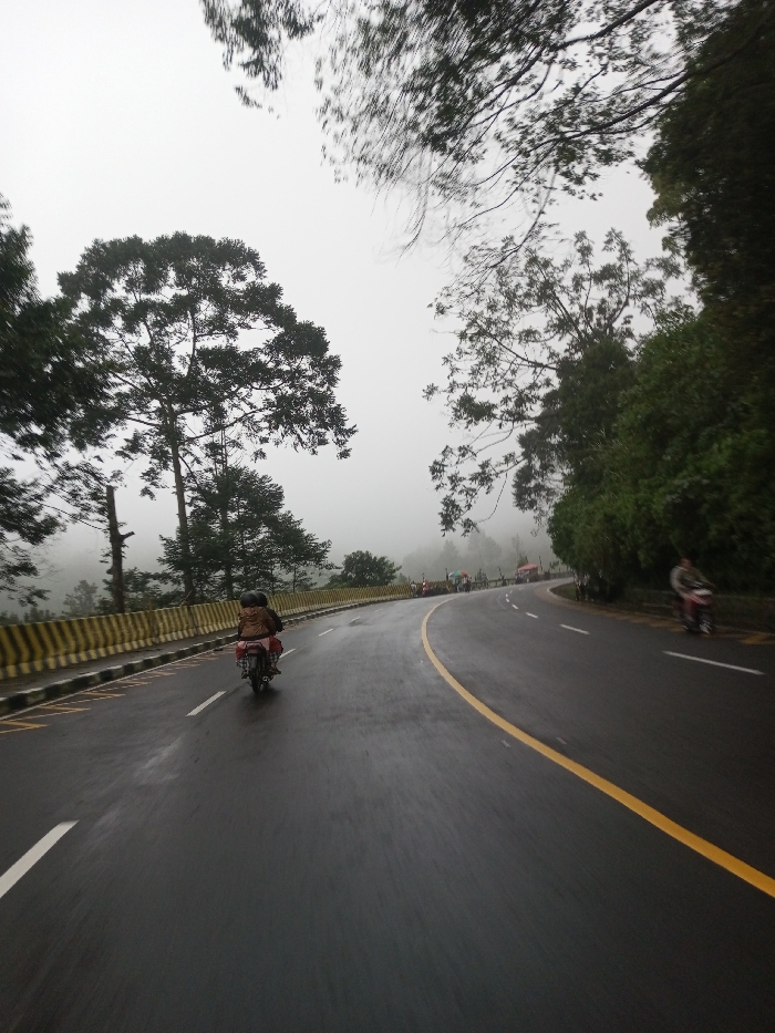 The image displays a wet asphalt road traversing a mountainous, fog-laden landscape in Dawathang_Dorjibi_ Kashingtsawa, Bhutan
