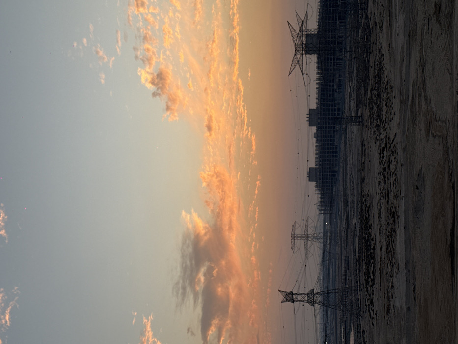 The scene depicts an expansive outdoor landscape in Ajman, United Arab Emirates, during either sunrise or sunset. The sky occupies the upper two-thirds of the image, exhibiting a gradient from light blue-grey at its zenith to vivid orange, peach, and yellow hues near the horizon, with scattered clouds illuminated by these colors. The lower third of the frame comprises barren, uneven, sandy ground, consistent with an arid environment or a development area. Dominating the midground are multiple high-voltage electricity transmission towers of varying structural designs, supporting numerous power lines that traverse horizontally across the frame. In the distant midground, a large, multi-story building complex is visible under construction, presenting an exposed skeletal framework. No individuals, vehicles, or active discernible human interactions are present within the captured scene.
