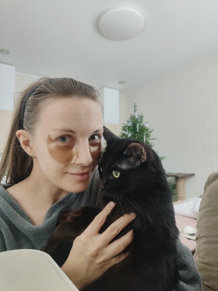 The scene depicts a Caucasian female and a black cat in an indoor residential setting in Chaikovsky, Russia