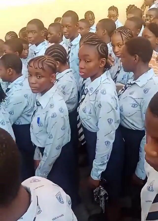 A group of about 30 students in school uniforms are standing in a courtyard. They are mostly facing forward and to the left, though some are looking at the camera. Most of them are wearing the same uniform shirt and dark pants or skirts. A few people are facing away from the camera. One man, also in a school uniform, is walking and talking to the students. The environment is bright, suggesting it is an outdoor scene. There is a wall on the left with a barred window in the background. The video is shaky, indicating the recording device is handheld. The text "TECNO SPARK 9" is visible in the bottom left corner.