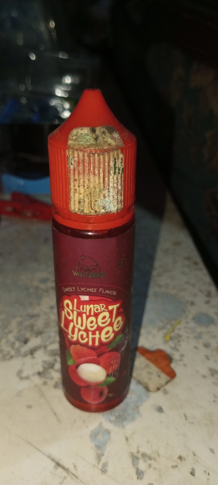A bottle of Vapezoo "Lunar Sweet Lychee Flavor" e-liquid is shown. The bottle is red with a white and red label displaying the flavor name and lychee fruits. The cap is red, and a damaged, off-white sticker is partially attached to it. The sticker appears old and possibly moldy. The bottle is standing on a white, slightly dirty surface, next to an orange and white object.