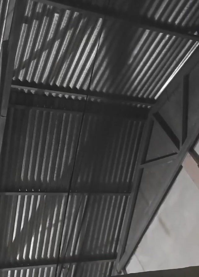 close-up, low-angle view of a corrugated metal roof structure. The metal sheets are visibly supported by a framework, and there are intersecting metal beams adding to the structural integrity. The lighting is dim, casting shadows across the corrugated surface. No people are visible.