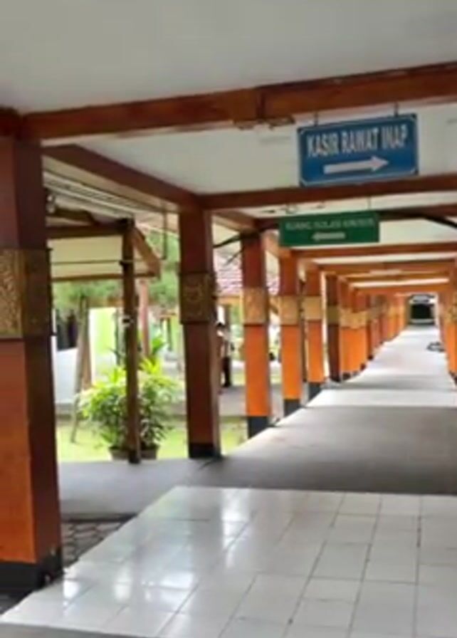 covered walkway with brown wooden support posts, each decorated with a rectangular carving in a lighter wood. The walkway has a white-tiled floor with gray grout. Overhead signs indicate "Kasir Rawat Inap" and "Ruang Isolasi Khusus". Outside the walkway, there is a courtyard with some palm trees, a green and white building, and a brown-roofed pavilion. A person walks in the background. The camera moves slowly along the walkway.