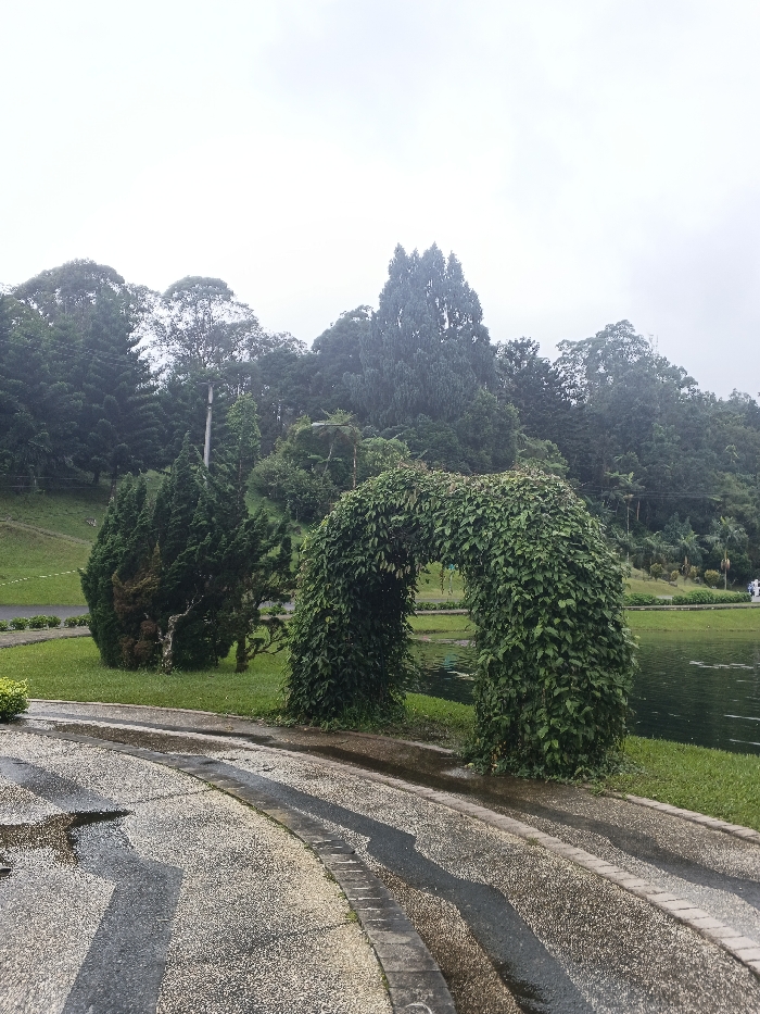 The image depicts a park-like setting under an overcast sky, observed from a low vantage point. In the immediate foreground, a curvilinear, wet, paved pathway with a speckled grey surface and irregular dark grey stripes extends from the lower left, curving towards the lower right. A dark-colored curb borders the inner edge of this pathway. Adjacent to the path on the right, a manicured green lawn is visible. Centrally positioned on this lawn, to the right of the pathway, stands a large, arch-shaped structure entirely covered in dense, green foliage, suggesting a living archway. To the left of the arch, a cluster of evergreen shrubs and a conical conifer tree are present on the grass. Beyond the lawn and the arch, a calm body of water with a dark surface is visible, reflecting the bright sky faintly, and is bordered by further green grass on its far side. The background is dominated by a dense, dark green forest or woodland covering gently rolling hills, extending upwards into a uniformly bright, white-grey overcast sky. No individuals or animals are present in the scene. The surfaces appear damp, consistent with recent precipitation. This natural or landscaped environment is located within Matopos, Zimbabwe.