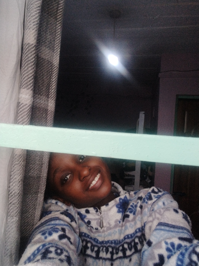 A young woman smiles from behind a light green window frame. She wears a white and blue patterned jacket. A patterned curtain hangs to the left. A single light shines brightly in the darkened room behind her. Part of a door can be seen in the background. The image appears to be a selfie taken indoors.