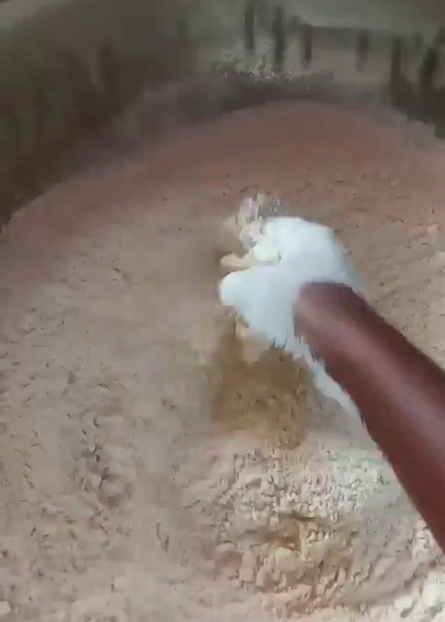A close-up shot reveals a metal bowl filled with a tan-colored, powdery substance, possibly flour or a similar ingredient. A hand, covered with a grey glove, is seen mixing the powder. The hand repeatedly moves in a circular motion, blending the substance within the bowl. The background is slightly out of focus, but a shelf with a bucket and a pot can be seen. The video seems to capture the initial stage of food preparation, where ingredients are being combined.