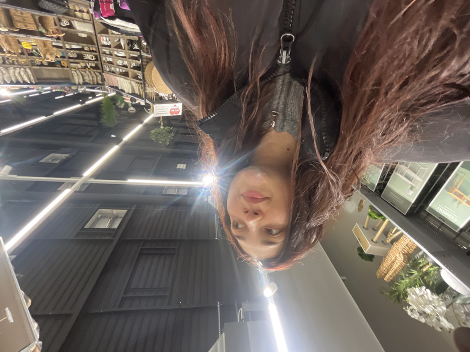 An image, captured within a retail establishment in Oberhausbergen, France, displays a young adult female from the chest up, positioned slightly to the right of the frame, looking upward and to the left