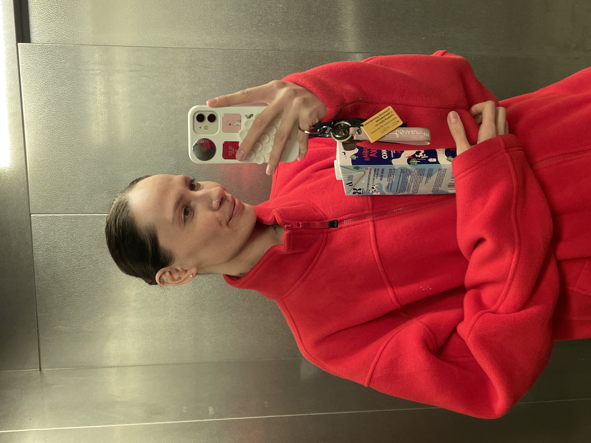 A female subject is depicted in a mirror selfie taken within an elevator. The elevator interior features textured, light-colored metallic panels. The subject has dark hair pulled back and wears a red fleece jacket with a high collar and a partial zipper visible. Facial piercings include a ring in her nose (septum or nostril) and a labret piercing. Multiple ear piercings are also present. A faint tattoo is visible on the right side of her neck. She holds a white smartphone with a decorative case featuring multiple stickers (including a prominent dark circular one and smaller square designs, one with a feline image) in her right hand, pointing towards the mirror. A set of keys, attached to a keyring with a yellow rectangular tag displaying partially discernible Cyrillic text (e.g., "...РАННОЕ..."), hangs from her right hand. In her left hand, she holds a white carton of a beverage, likely a dairy product, with blue and white branding featuring cow illustrations and partial Cyrillic text (e.g., "РАННОЕ" and "ОКО"). The subject is looking towards the phone with a slight smile. The specific location within the city of Izhevsk, Russia, cannot be determined from the visual information provided in the image.