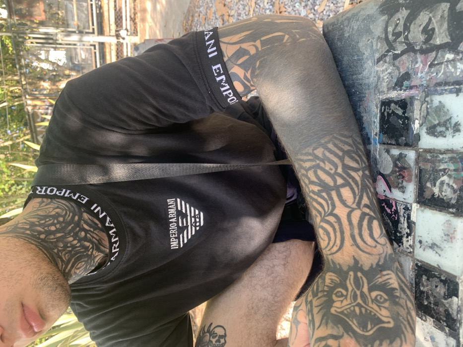 A man with extensive tattoos is seen in a close-up shot. Tattoos cover his arms, neck, and partially visible legs. He wears a black Emporio Armani t-shirt. A black strap crosses his chest. The man is sitting next to a tiled surface with graffiti. The background shows an outdoor setting with greenery and a fence. The image is rotated, making the man appear sideways.