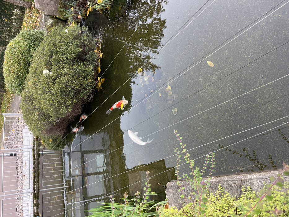 This image depicts a clear pond in Oppenau, Germany, viewed from an elevated perspective. The water is largely transparent, revealing a light-colored, possibly paved, bottom with some visible sediment and fallen leaves. Four Koi fish are present: a prominent white Koi swims towards the right in the central-left area; a prominent white, red, and yellow Koi, also swimming right, is positioned centrally with a distinct yellow marking on its dorsal surface; and two smaller, partially visible orange and white Koi are located further back, near a large, dense, rounded green bush that occupies the upper-right portion of the pond. Several thin, light-colored parallel lines, likely wires or strings, extend diagonally across the water from the lower-left to the upper-right. The immediate left foreground features a concrete border supporting a trailing green plant with reddish stems. In the upper background, a metal railing or fence is visible across the pond, reflected in the water, with a sparse, gravel-like ground texture beyond it. No human subjects are visible.
