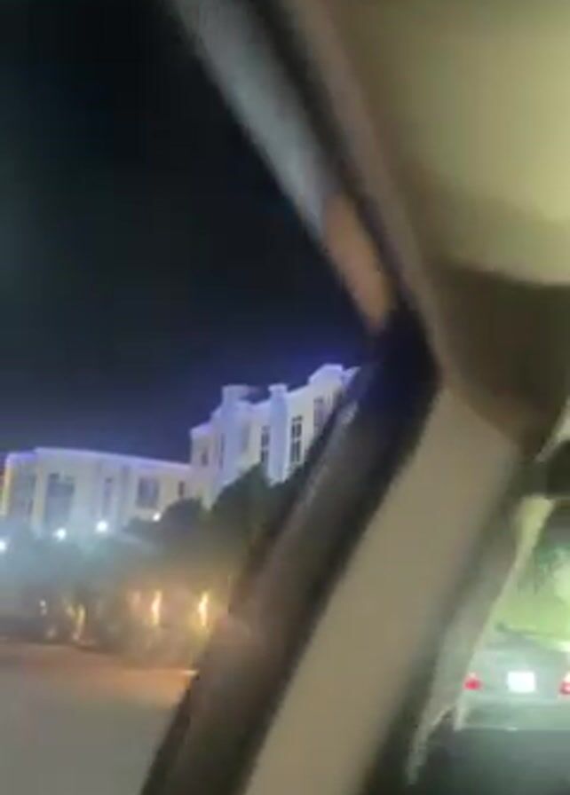 view from inside a car driving at night. Outside the car, there is a multi-story building lit with white and blue lights. There are also trees and streetlights. The car then turns and the building is partially obscured from view. Other lights are visible in the background. The video seems to be taken on a phone. There is music audible in the background.