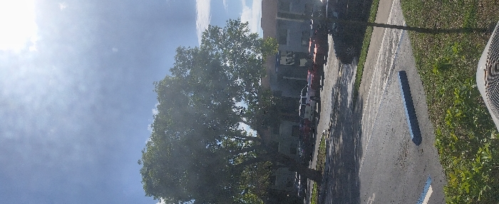 This image depicts a daytime outdoor scene in Cutler Bay, United States of America, captured from a slightly elevated vantage point. The upper half of the frame shows a bright blue sky with scattered, wispy white clouds; a strong solar glare is evident in the upper right quadrant. A large, mature tree with dense green foliage occupies the left-center, extending into the upper-center of the image. Below the tree and extending across the mid-ground is an asphalt surface, identified as a parking lot or access road, which features faded white painted parking lines. A single blue, elongated parking stop bumper is visible in the lower-center of this asphalt area. Multiple vehicles are present on the asphalt. A white SUV or truck is parked in the mid-ground to the left of center, oriented towards the left. Several red vehicles, appearing to be cars or trucks, are parked behind the white SUV and further to the right. Darker-colored vehicles are partially visible on the far right edge of the parking area. In the background, behind the vehicles and the tree, are multi-story buildings with light-colored facades, consistent with residential or commercial structures. The foreground, along the bottom edge of the image, displays green ground cover and the top portion of a textured, possibly metallic or gridded, object. No individuals, specific actions, or interactions are discernible within the scene.