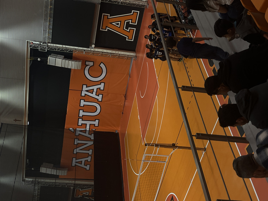 An indoor volleyball court with an orange floor is seen from an elevated angle. A team huddles on one side of the net. Banners with the word "ANÁHUAC" and a large "A" adorn the walls. Spectators sit in the foreground, partially obscuring the view. The lighting is bright, and the overall impression is of a typical indoor sporting event.