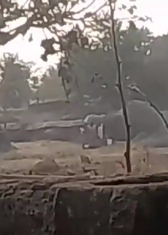 The video, shot at a distance and obscured by foreground elements, shows an elephant in a clearing