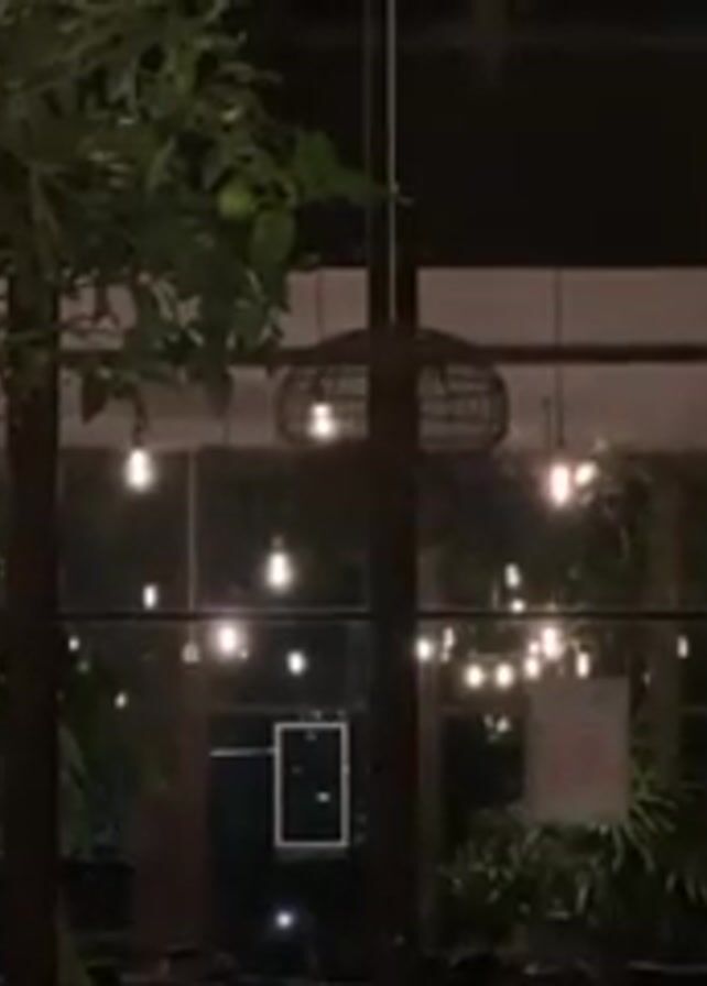 dimly lit outdoor area, likely at night. There's a tree with green leaves and what appear to be small limes on the left side of the frame. Behind the tree are large glass windows with dark frames, possibly enclosing an indoor space. Strings of lights hang in front of the windows and within the enclosed space, adding to the dim lighting. A decorative light fixture hangs from the ceiling inside the glass structure. Signs are visible inside the glass area. A security camera is mounted near the top of the frame on the right. Overall, the scene has a cozy and somewhat atmospheric quality.