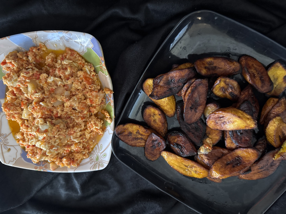 The scene depicts two plates of food arranged on a dark, possibly black, fabric surface. The location is in the city of Dutse, Nigeria. In the upper portion of the frame, a rectangular white plate with a subtle floral and leaf pattern in green, orange, and blue hues holds a serving of scrambled eggs mixed with diced tomatoes and onions, characterized by a reddish-orange hue and some visible oil. Below and to the left, a rectangular black plate contains numerous slices of fried plantain, varying in color from golden yellow to dark brown and nearly black, indicating different levels of caramelization. No people are visible, and no actions or interactions are depicted beyond the presentation of the prepared food. The dark fabric background shows soft folds, suggesting a draped material.