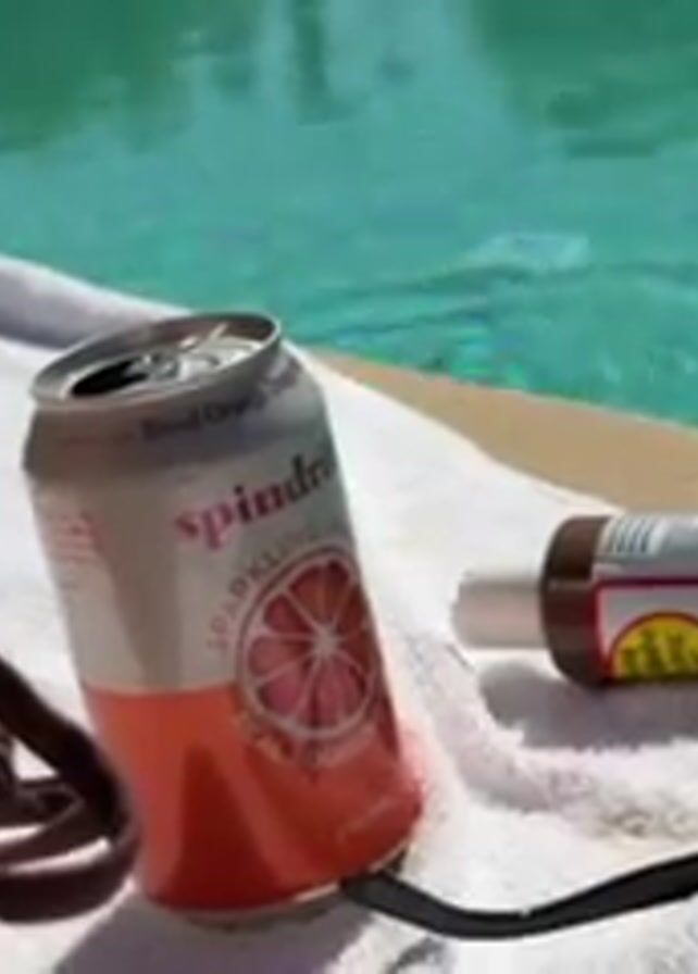 A sunbathing scene shows a partially visible person wearing a brown swimsuit lying next to a pool. A white towel sits on the pool’s edge, holding an open can of Spindrift sparkling water (Blood Orange flavor), a bottle of sunscreen, and a pair of sunglasses. The pool water is turquoise. The scene is brightly lit.