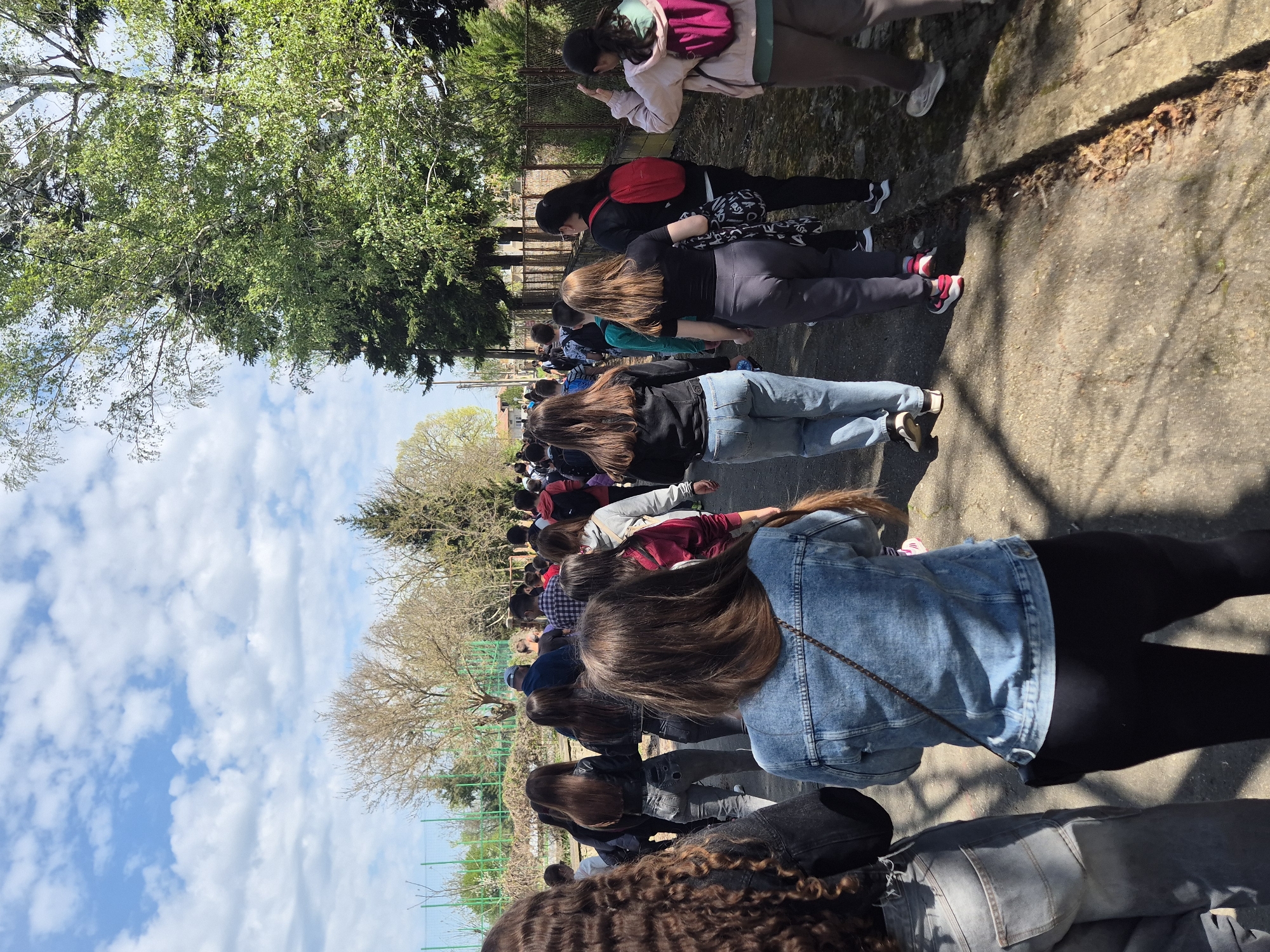 A long line of people stand outdoors on a paved pathway. The individuals face away from the viewer, with their backs visible. They appear to be waiting or participating in an event. Trees and blue sky with clouds are visible in the background. The location is likely near Byala Cherkva, Bulgaria, but is not specifically identifiable.
