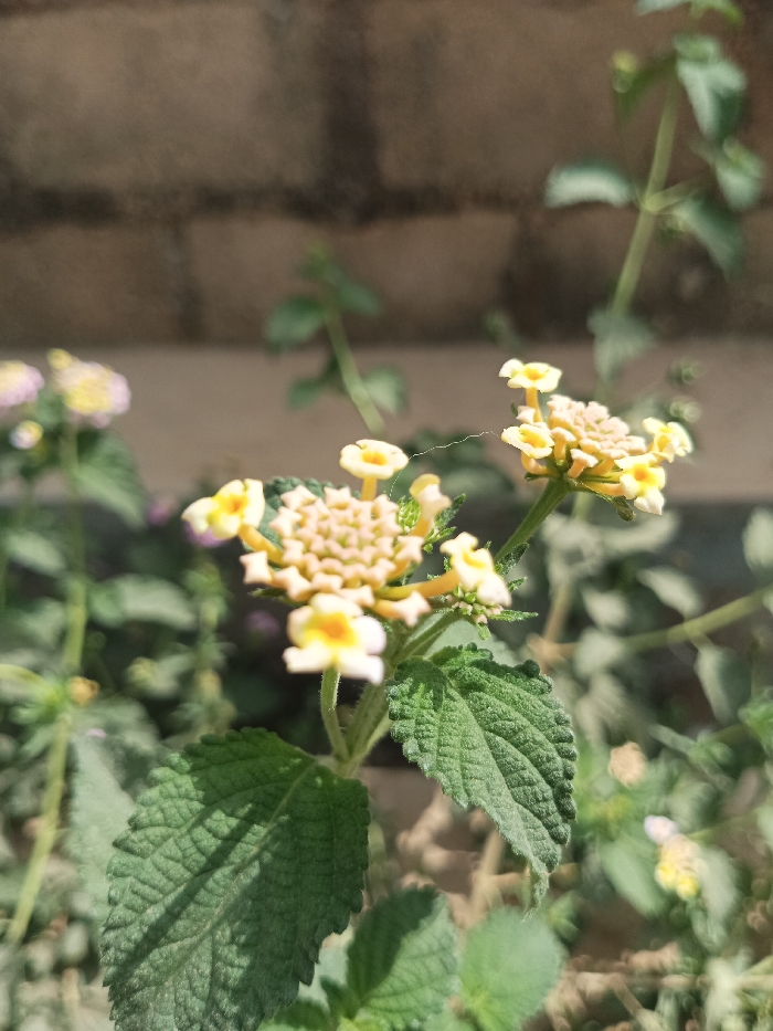 This image captures a close-up, outdoor scene in Katon Rikkos, Nigeria, focusing on a cluster of small, light yellow to cream-colored flowers, likely Lantana camara. The primary subject is sharply in focus, revealing individual florets with brighter yellow centers and a tightly packed, textured central mass of developing buds. Green, textured leaves with visible veins and serrated edges are prominent below and around the flower cluster, exhibiting distinct shadows. A fine, delicate strand of spider silk is visible stretching horizontally across the upper portion of the central flower cluster. In the blurred background, additional green foliage and faintly discernible flower clusters, some with a pinkish hue, are present. The top half of the background shows a heavily out-of-focus brick wall, suggesting a nearby structure. The scene is brightly illuminated by natural light, indicative of daylight conditions. No human subjects or discernible actions are present.