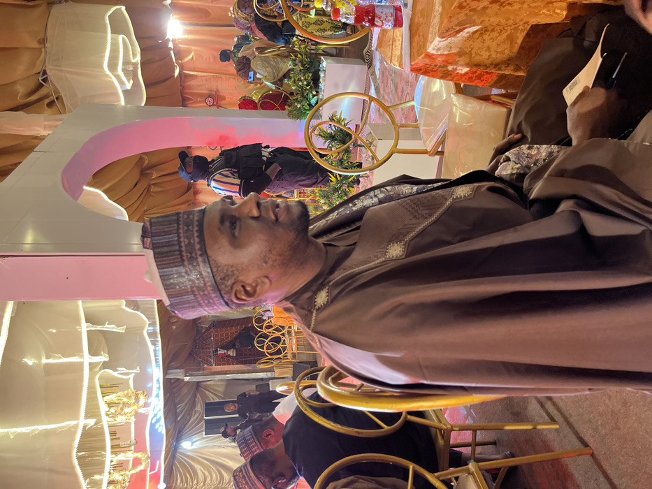 A man in a brown traditional outfit and cap faces left, seated in a gold chair. Behind him, a security officer in a black vest and face covering stands amidst elaborate decorations. Further back, others are gathered, some in similar traditional attire. The setting seems to be an indoor event with golden accents and decorative lighting. Bottles of water are visible on a table in the background.