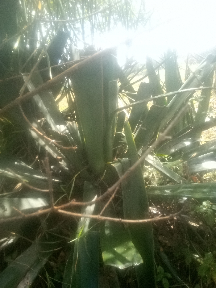 The scene, located in the city of Unknown, Unknown, presents a dense, overgrown outdoor environment. The central subject is a large, green plant with thick, pointed leaves, consistent with a succulent or bromeliad, occupying the foreground and midground. Multiple thin, bare, brown branches are interwoven across the plant's front, forming a partial obstruction. The background is severely overexposed by a bright light source, appearing predominantly white, with indistinct vertical plant stalks, possibly bamboo, faintly visible through the glare. Ground cover consists of dry earth and sparse smaller vegetation visible through gaps in the primary foliage. No people, animals, or discernible actions are observed.
