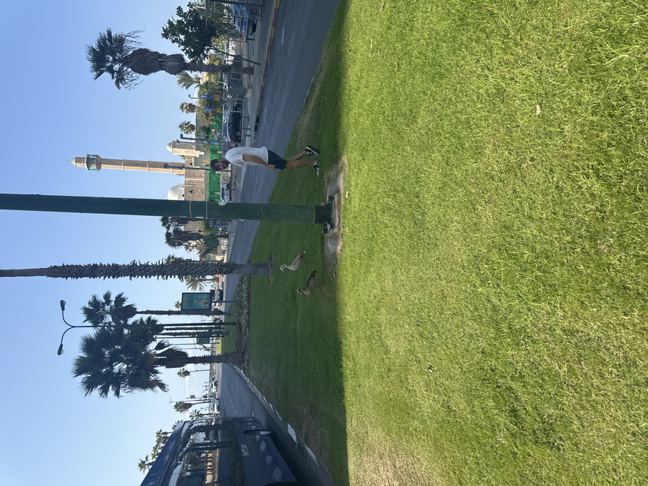 This image depicts an outdoor scene in Jaffa, Tel Aviv-Yafo, Israel, on a clear, sunny day. The foreground consists of a wide expanse of green grass. Two light brown waterfowl, resembling ducks or geese, stand on the grass towards the left. A dark green utility pole with a concrete base is positioned slightly right of center on the grass. A male individual, wearing a white short-sleeved t-shirt, dark shorts, and dark sneakers, stands on the grass to the right of the pole, looking towards the camera. In the midground, a dark blue bus is partially visible on a paved road to the left. A multi-lane road separates the grassy median from a further strip of vegetation and additional traffic lanes. Several tall palm trees and streetlights line the grassy median and the side of the road. Multiple vehicles are visible on the road. The background is dominated by the Mahmoudiya Mosque, featuring a prominent, tall, light-colored minaret and beige stone buildings topped with white domes. The Mediterranean Sea is visible in the far distance beyond the road and urban infrastructure.