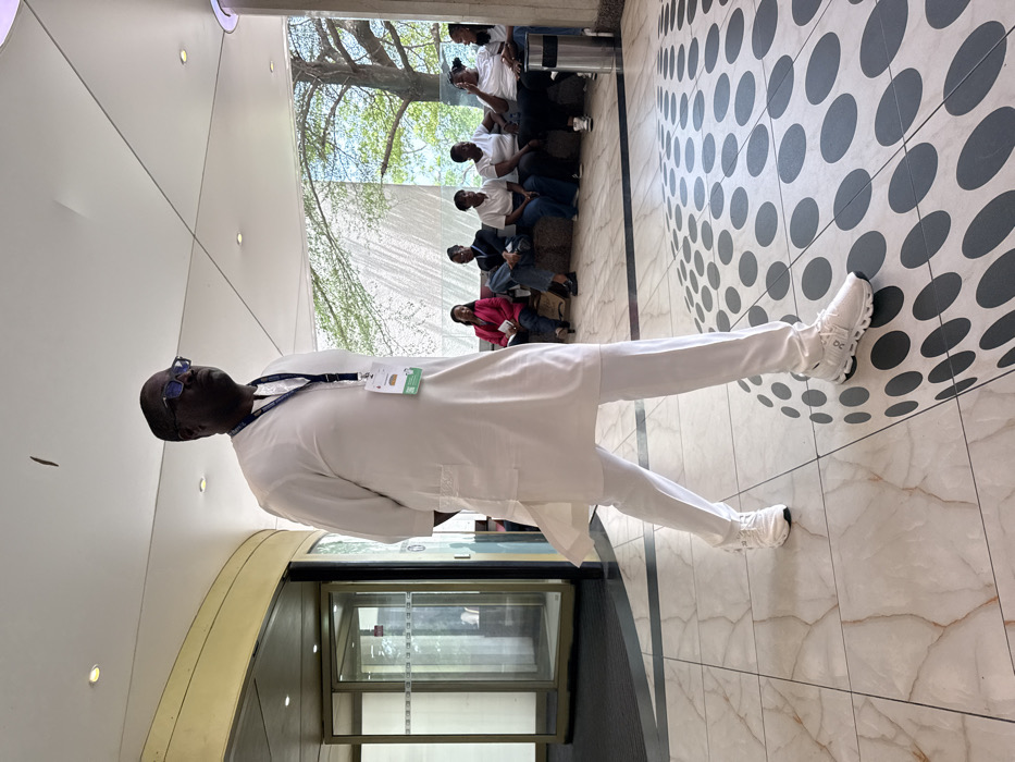 An adult Black male, approximately 40-60 years old, wearing a white traditional tunic, matching white trousers, and white athletic shoes, walks from left to right across a tiled floor in a public building in Itirin, Nigeria. He wears clear-framed glasses and a lanyard with multiple identification badges around his neck. His left foot is mid-stride, and his gaze is slightly upward and to his right. To the left, a revolving glass door with a metallic frame is visible. To the right, seven individuals are seated on a bench along a large window, beyond which a tree with green foliage is discernible. The floor in the foreground features a large circular pattern of dark grey dots on light tiles. A silver trash receptacle is positioned near the seated group. The interior is brightly lit.